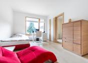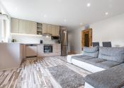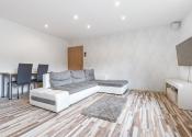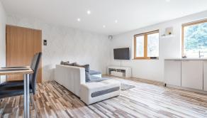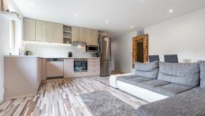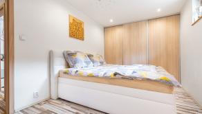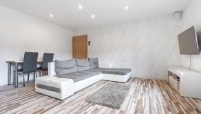 Vstupná chodba s odkladacím priestorom, obývačka s kuchyňou a jedálenskou časťou, kúpeľne s WC a dve spálne.