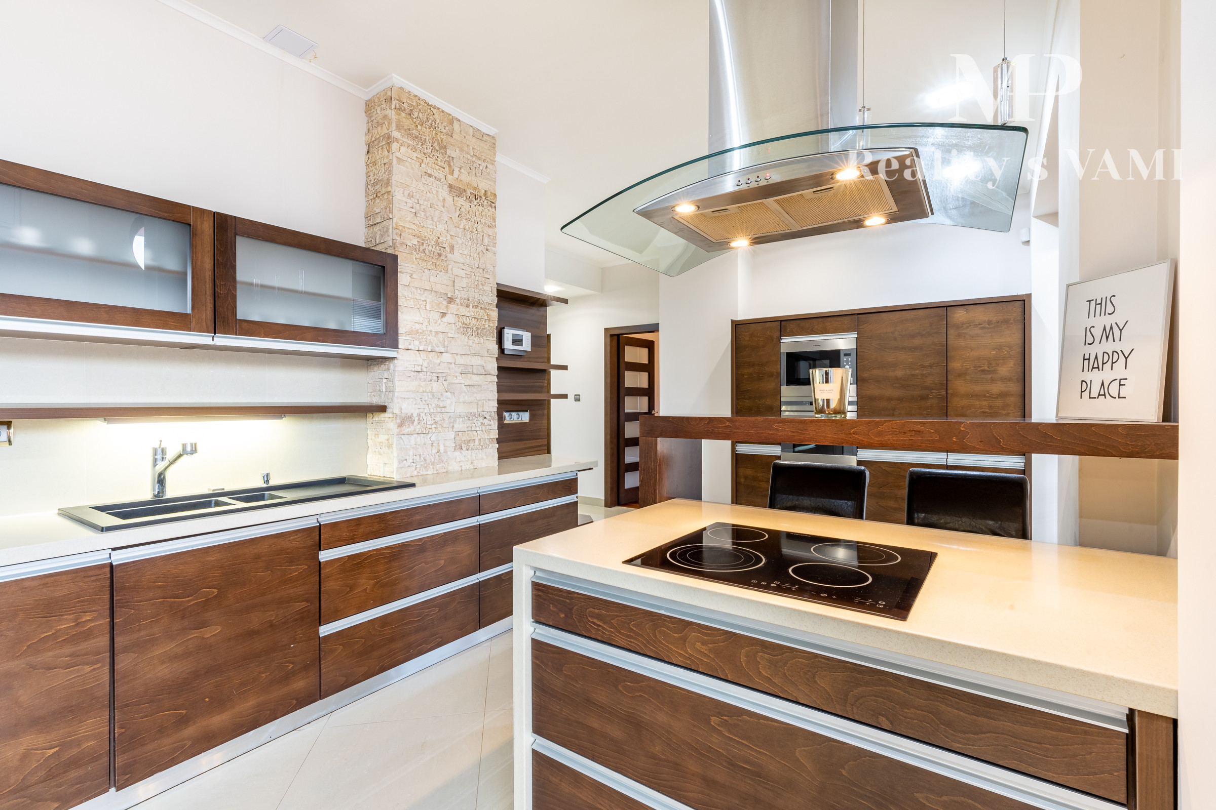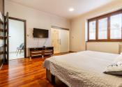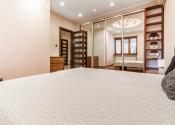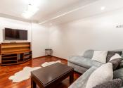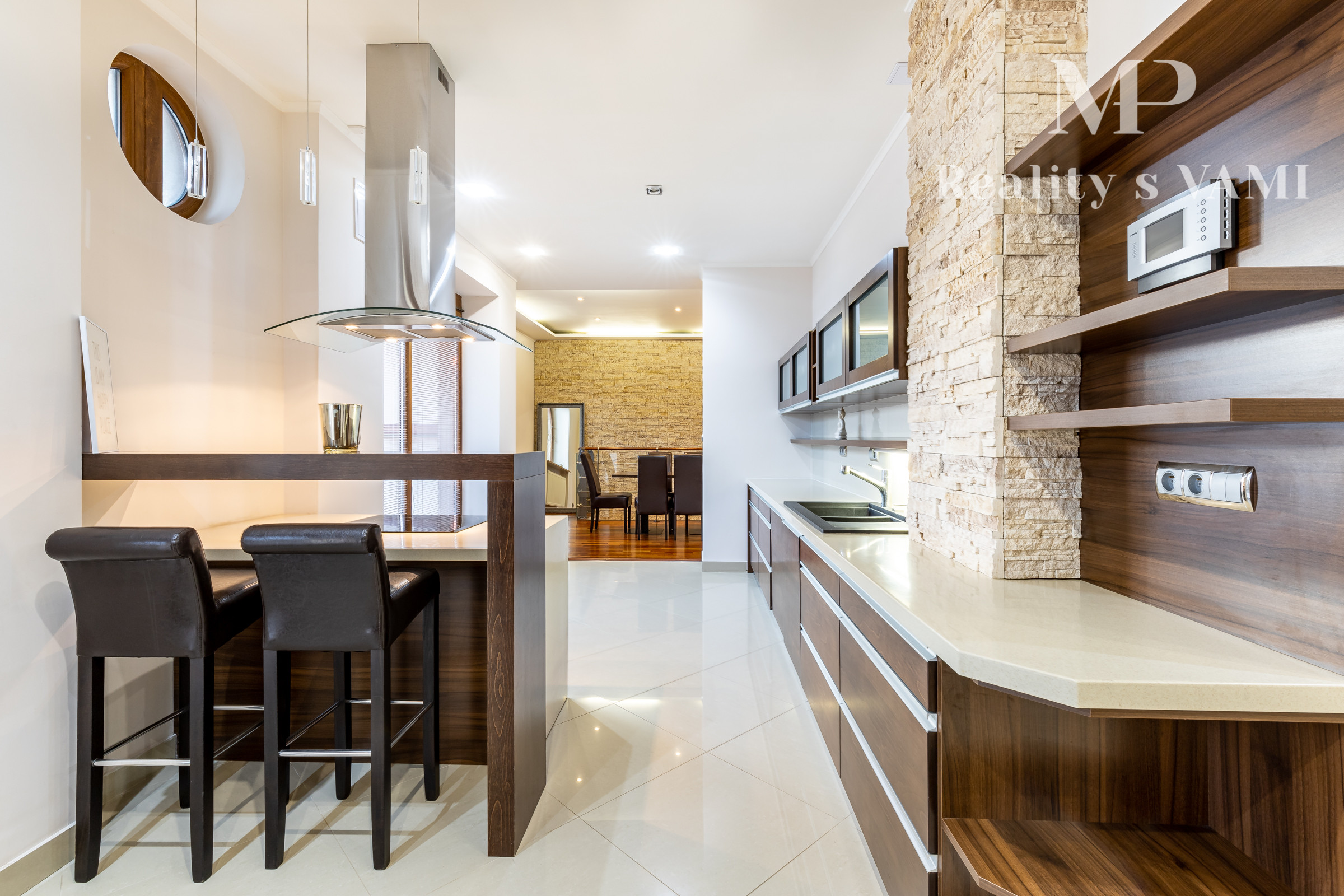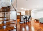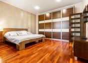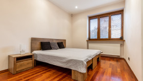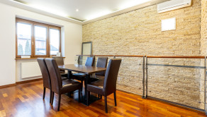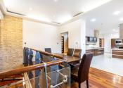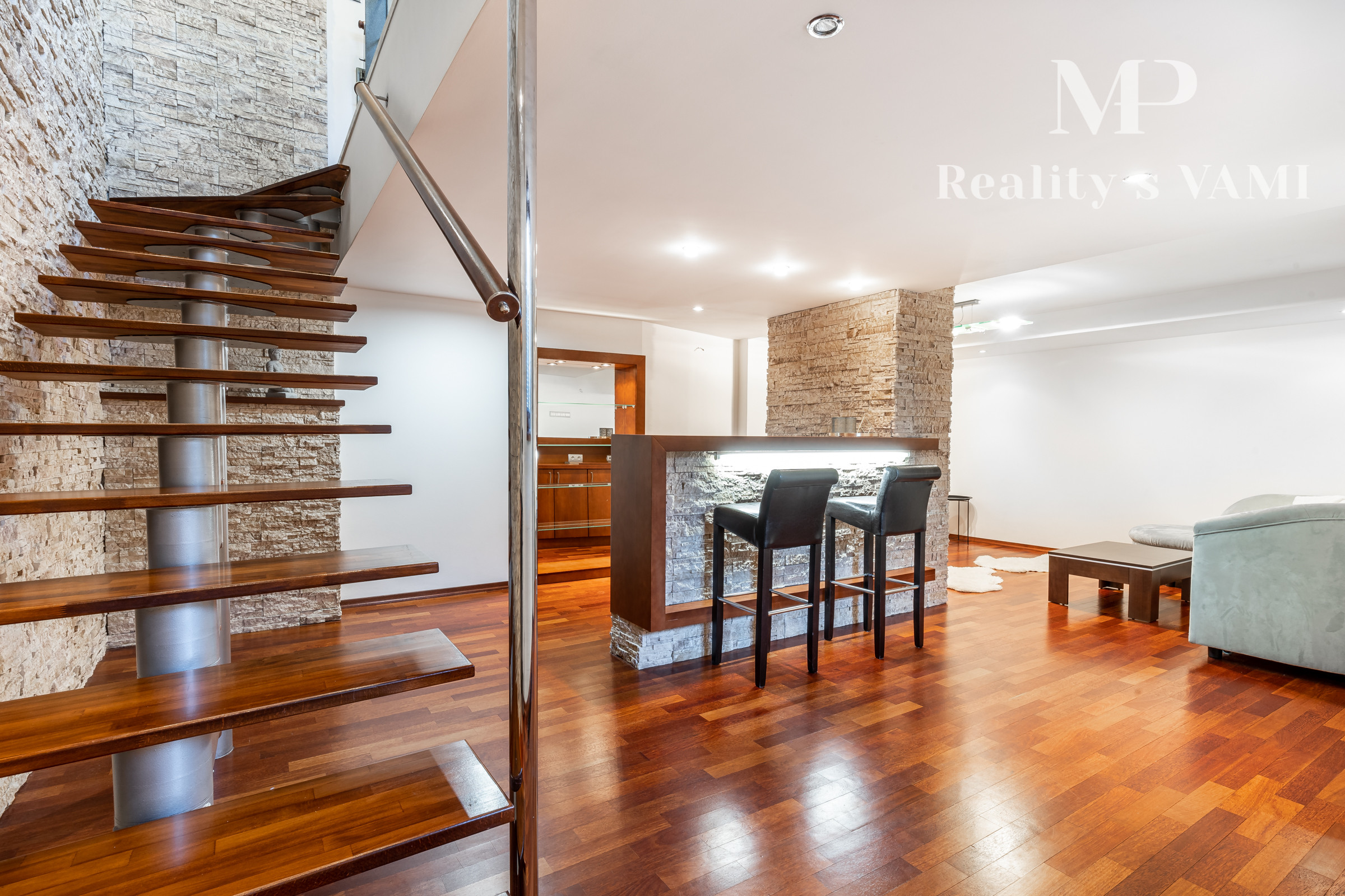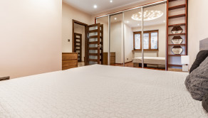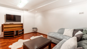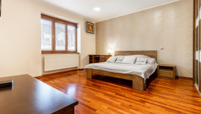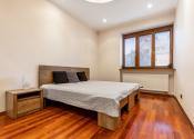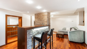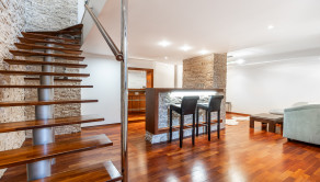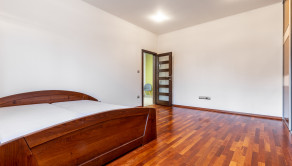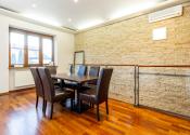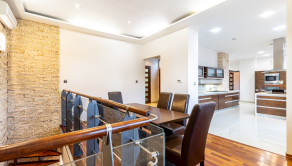 Po vstupe vás privíta priestranná chodba, z ktorej sa elegantne dostanete do jednotlivých častí bytu. Oproti vstupu sa nachádza prvá spálňa, hneď vedľa nej hlavná kúpeľňa so sprchovacím kútom aj vaňou a samostatné WC pre maximálny komfort. Z chodby plynule vstúpite do jedálenskej časti s veľkým stolom, ktorá prirodzene nadväzuje na priestrannú kuchyňu na mieru so zabudovanými spotrebičmi a ostrovčekom – miesto, kde sa stretáva dobré jedlo s atmosférou domova. Z kuchyne vedie výstup na veľkú terasu s posedením a ďalej do upravenej záhrady. V tejto časti sa nachádza aj druhá spálňa a hlavná spálňa s vlastnou kúpeľňou a WC. Pod úrovňou kuchyne a jedálne je situovaná štýlová obývačka s vlastným barom – ideálna na relax aj večery s priateľmi. Celý byt s rozlohou 220 m² je kompletne klimatizovaný, čo zaručuje komfort počas celého roka. Pohodlie dopĺňa parkovanie vo dvore a veľká pivnica, ktorá poskytne dostatok úložného priestoru.