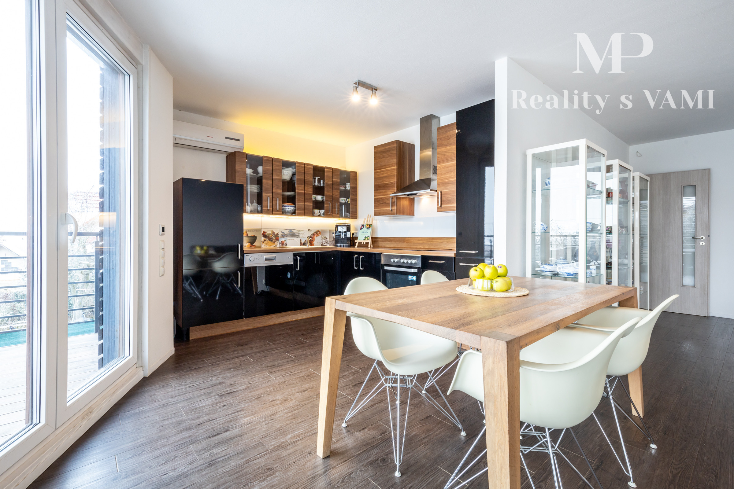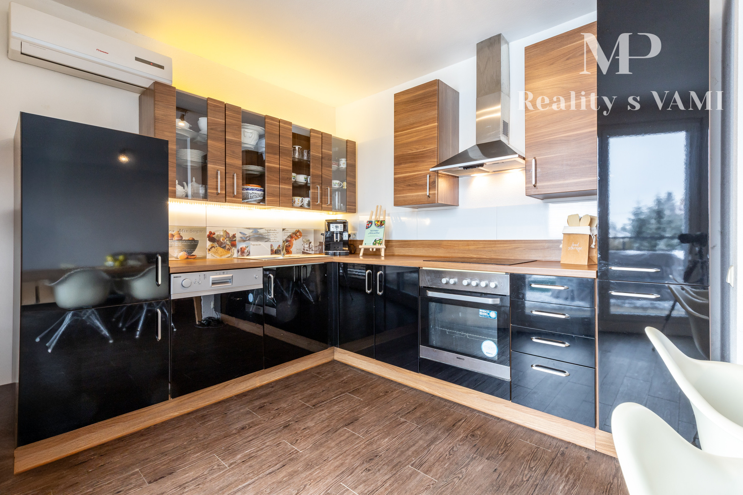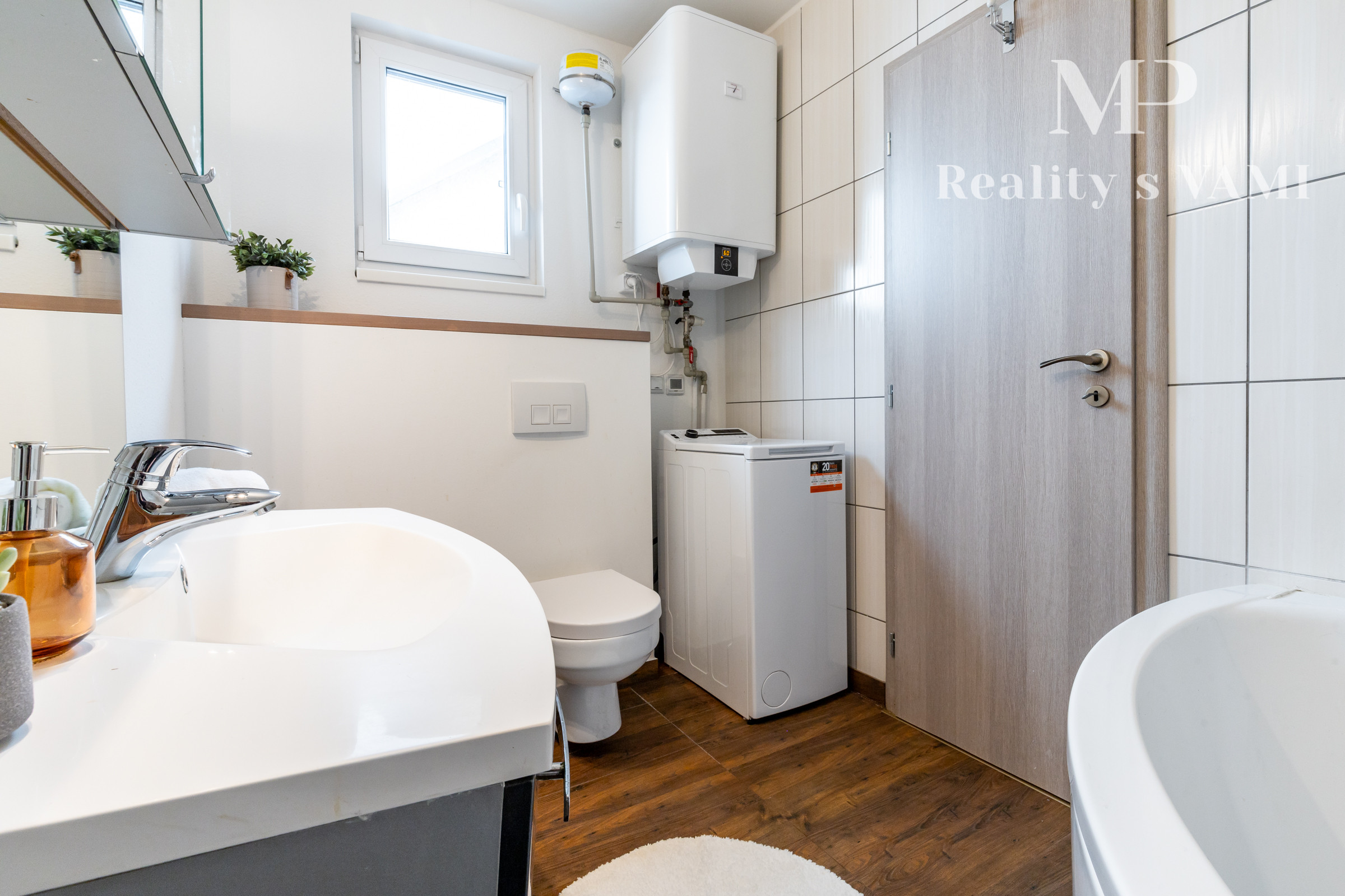 Rodinný dom je 3 izbový, s obytnou plochou 90 m², pričom zastavaná plocha vrátane terasy predstavuje 148 m². Pozostáva z priestrannej haly prepojenej s kuchyňou a jedálenským kútom, dvoch samostatných spální a kúpeľne s toaletou. Pozemok má rozlohu 884 m² a je kompletne oplotený a upravený. Dom je vybavený elektrickým podlahovým kúrením v každej miestnosti s individuálnym nastavením teploty a 6 komorovými plastovými oknami s trojsklom, ktoré zabezpečujú výbornú tepelnú izoláciu. Súčasťou je elektrická brána a komfortné parkovanie priamo na pozemku. Exteriér dotvára podsvietená terasa, drevené opláštenie Bangkirai a žulové schody, ktoré dodávajú domu nadčasový vzhľad.