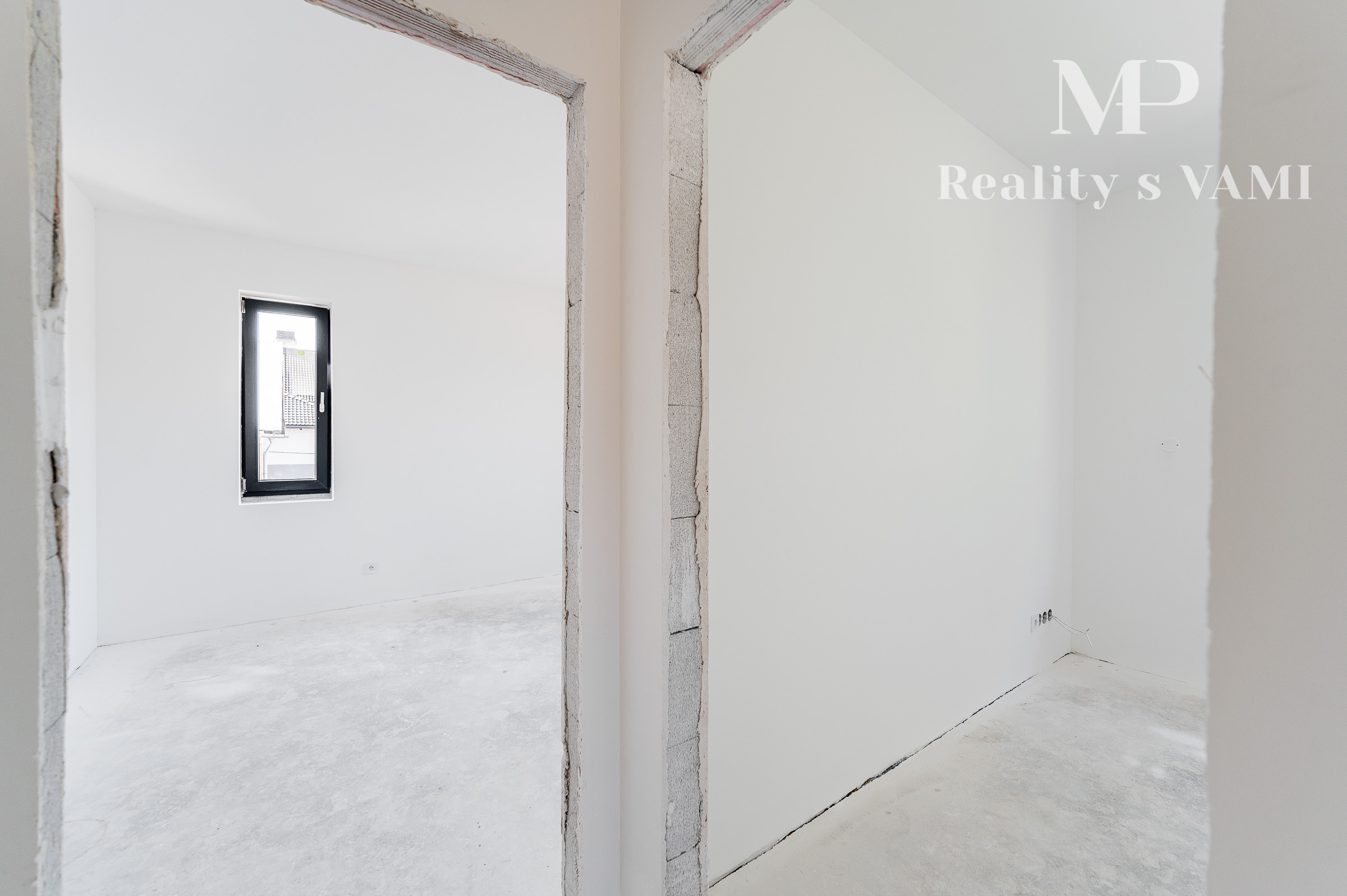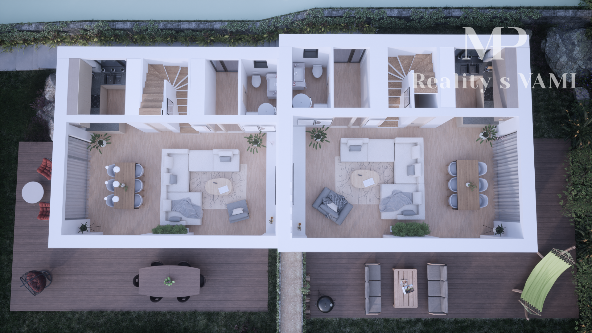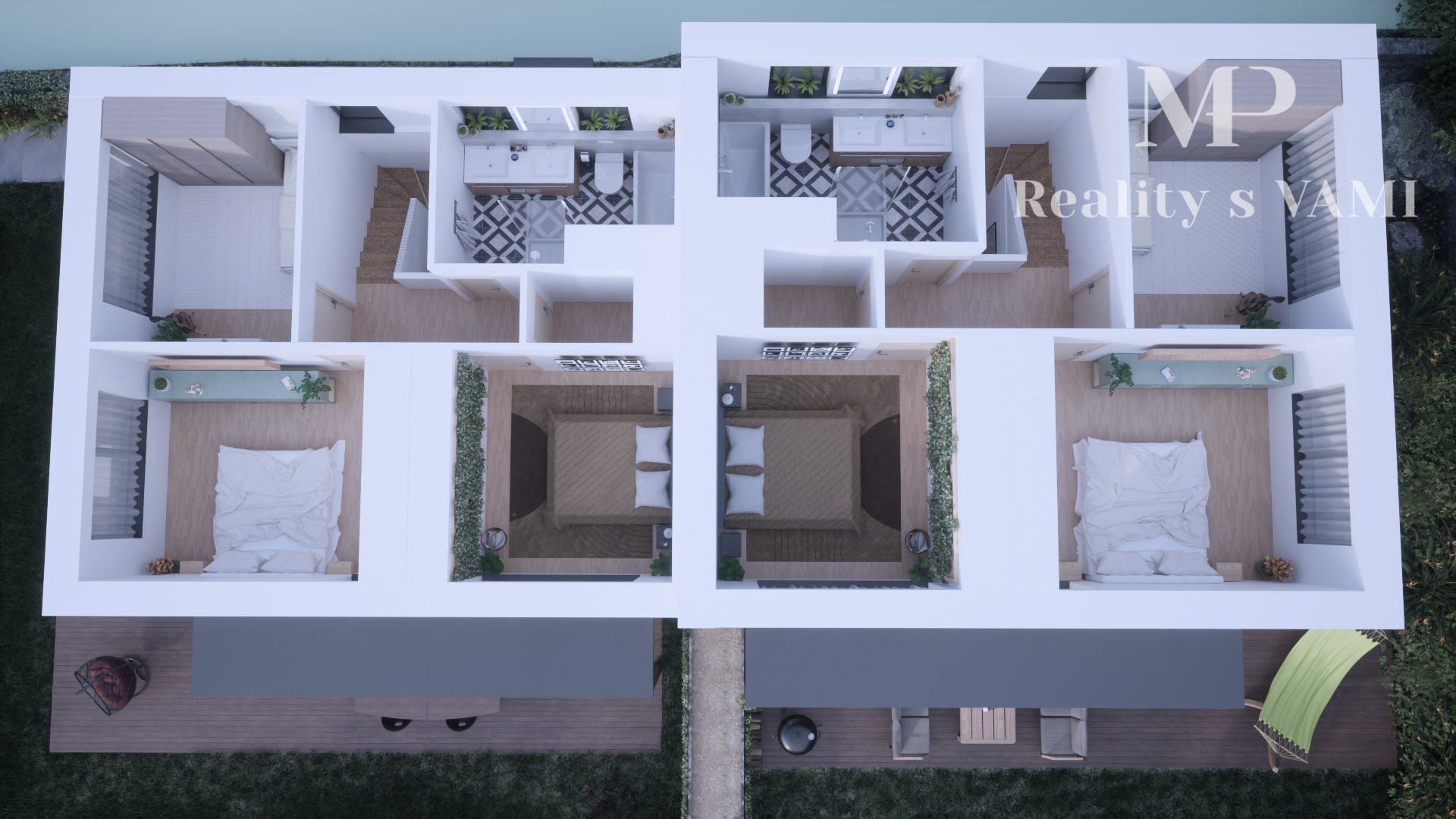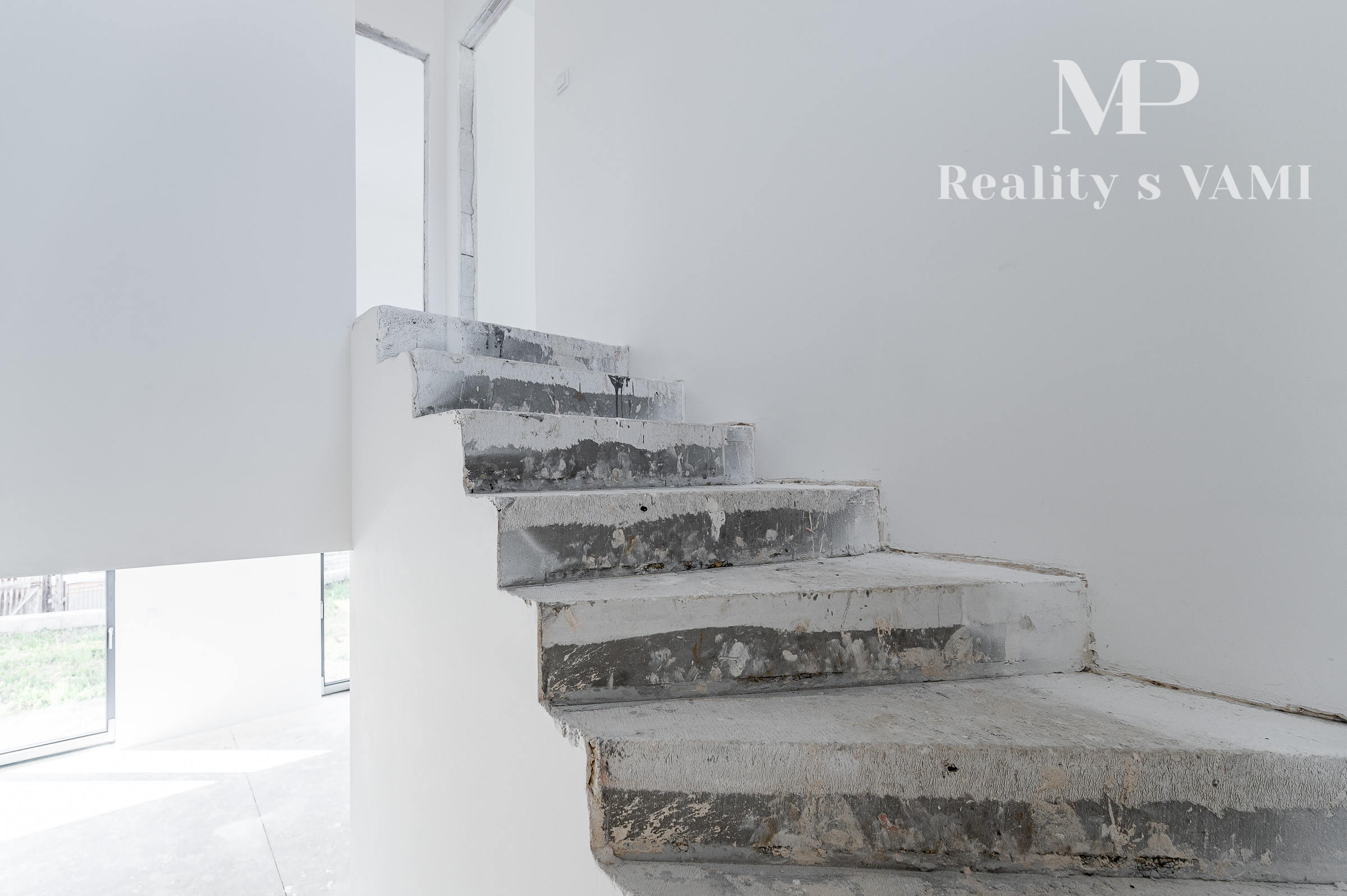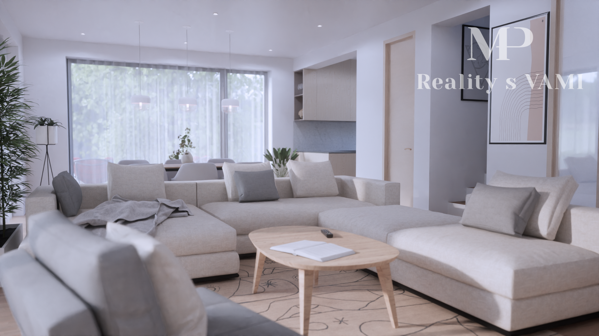 V dome vás na prízemí víta vstupná chodba a následne otvorená dispozícia obývačky, kuchyne a jedálne, z ktorej je priamy výstup na terasu a do záhrady. Tento priestor je navrhnutý na každodenné pohodlie a spoločné chvíle. Na druhom podlaží nájdete dve detské izby, hlavnú spálňu, šatník, dve kúpeľne a praktické zázemie domu. Každý meter tu má svoje využitie a výsledkom je funkčný, presvetlený a moderný interiér.