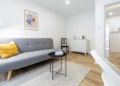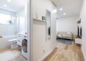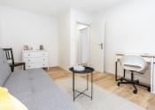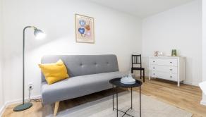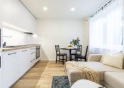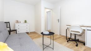 Dispozične je byt riešený veľmi prakticky – z chodby sa prechádza do obývacej izby spojenej s kuchyňou a jedálenským kútom, ďalej do spálne s balkónom, ďalšej menšej izby vhodnej ako detská izba či pracovňa a do kúpeľne s vaňou a WC. Byt pôsobí veľmi príjemne a vzdušne, stačí sa len nasťahovať.