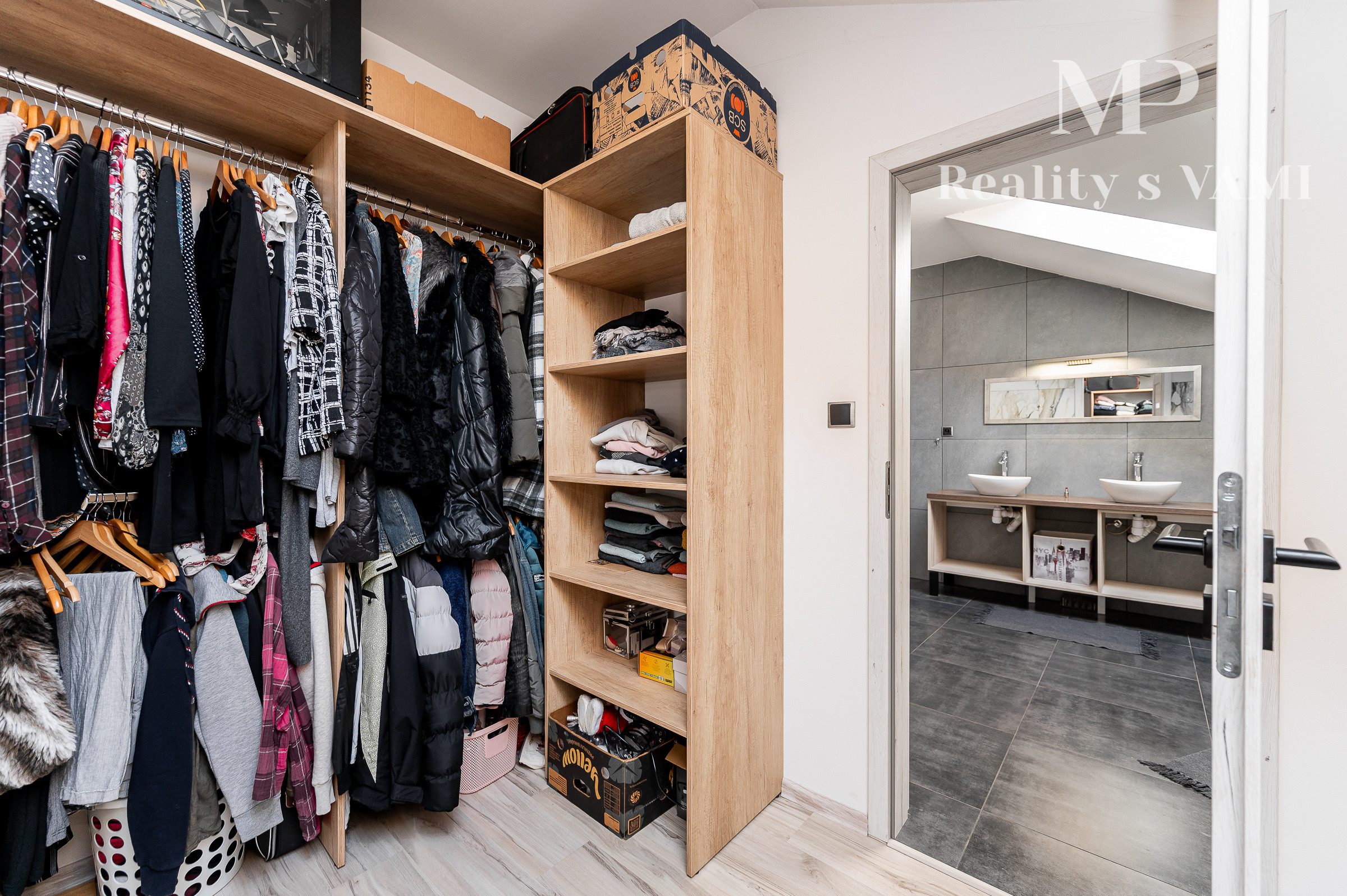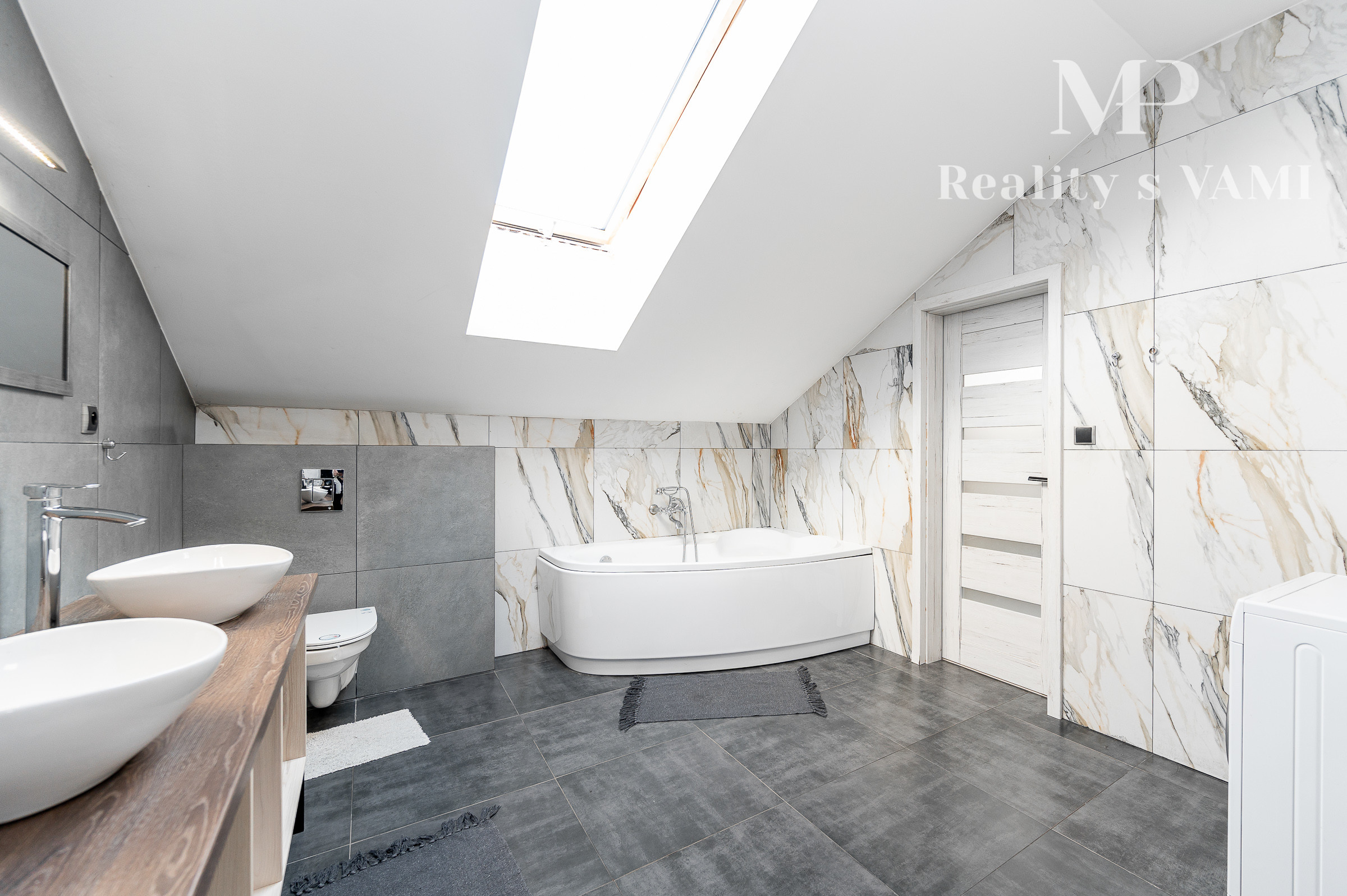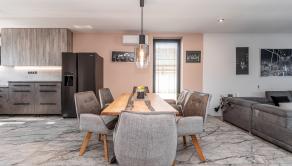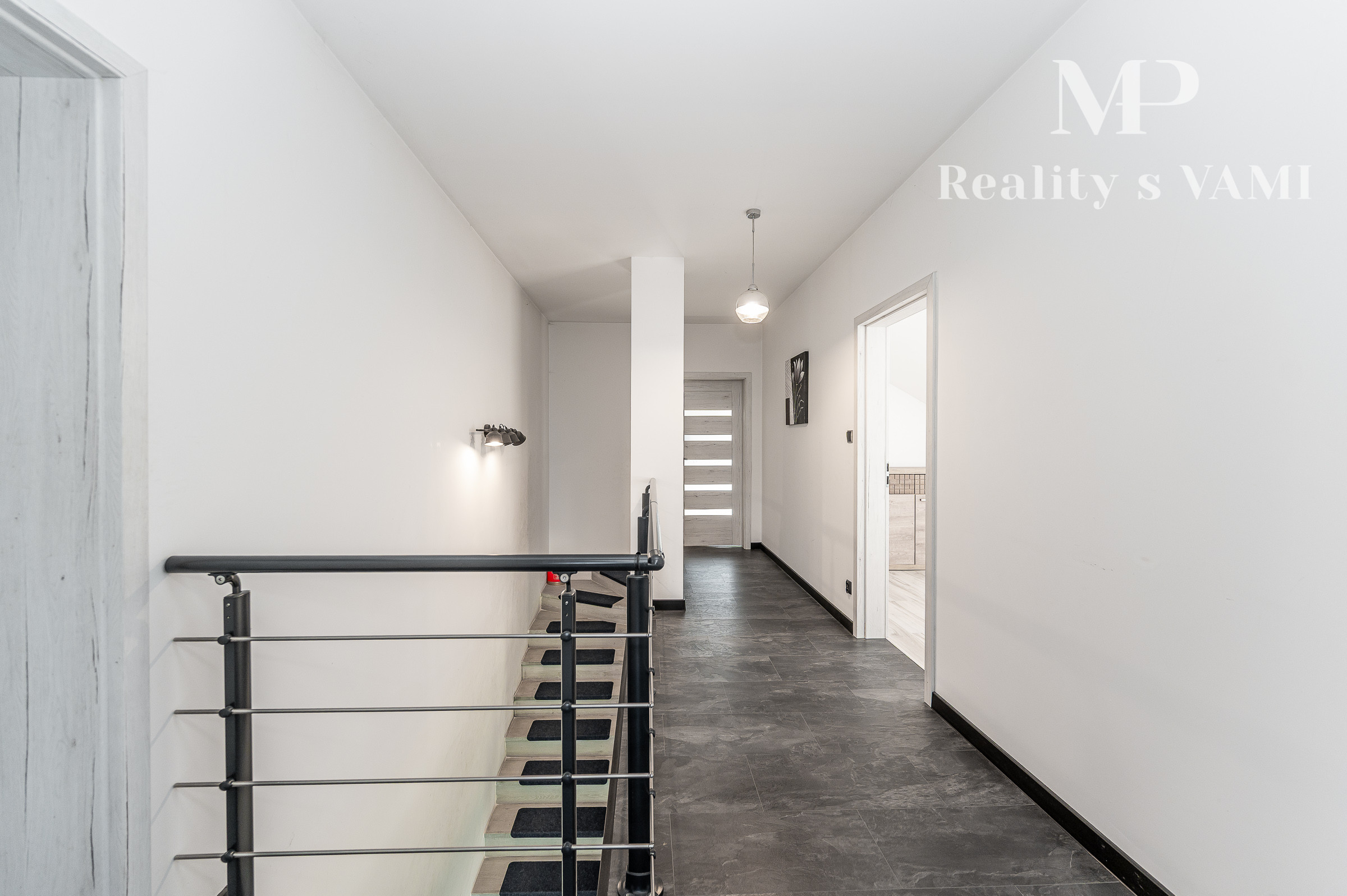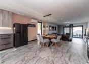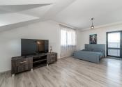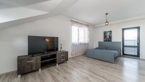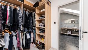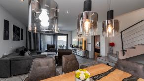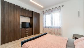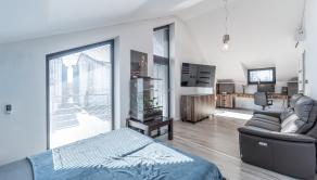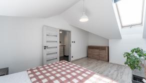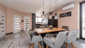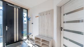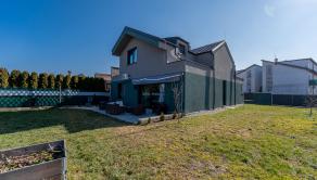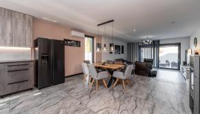 Prízemie domu ponúka praktické a zároveň veľmi komfortné rozdelenie priestoru. Nachádza sa tu vstupné zádverie, kúpeľňa s WC, samostatné WC, priestranná spálňa s vlastnou veľkou a luxusnou kúpeľňou, veľká obývacia izba prepojená s kuchyňou a špajza.Zo zádveria je priamy vstup do garáže, ktorá je krásne zariadená novým garážovým nábytkom a má kvalitnú dlažbu. Za garážou sa nachádza samostatná technická miestnosť.Na poschodie sa vystupuje schodiskom z obývacej časti. Podkrovie ponúka tri samostatné izby, šatník, kúpeľňu s WC a balkón. Súčasťou podlažia je aj priestranná terasa, ktorá vytvára ideálny priestor na oddych alebo rodinné posedenia.