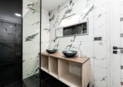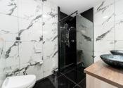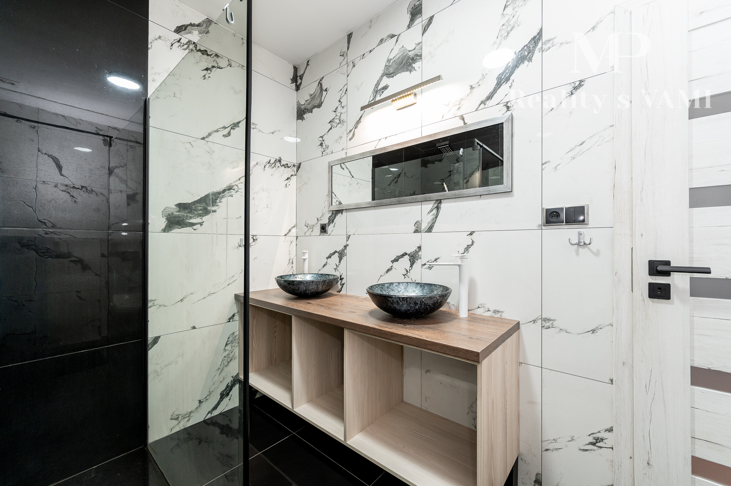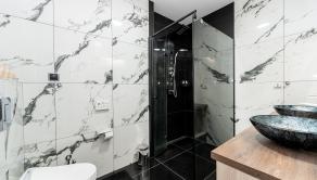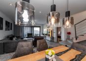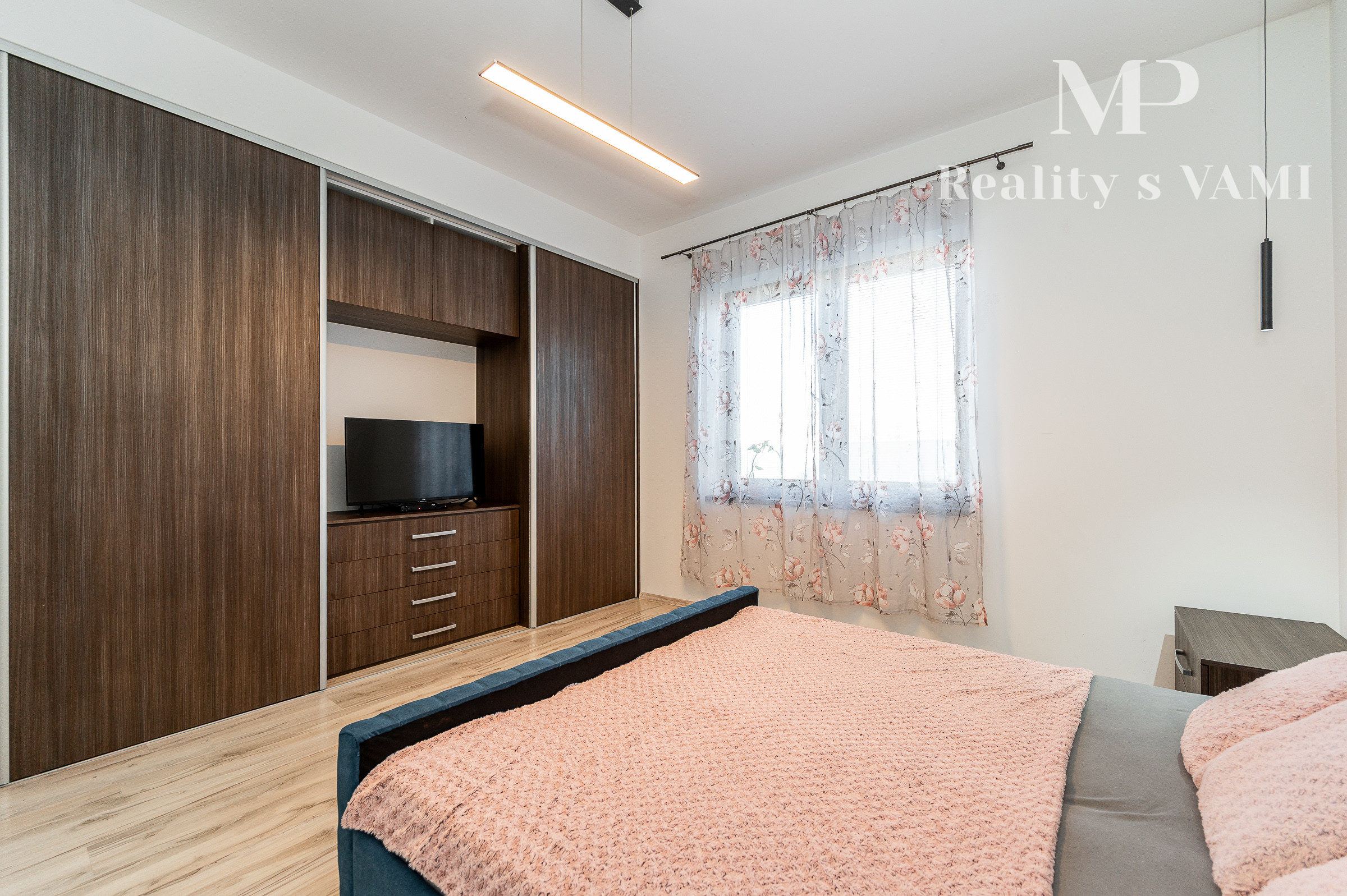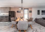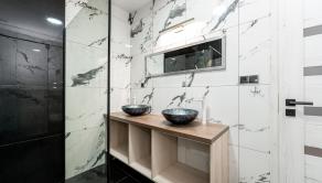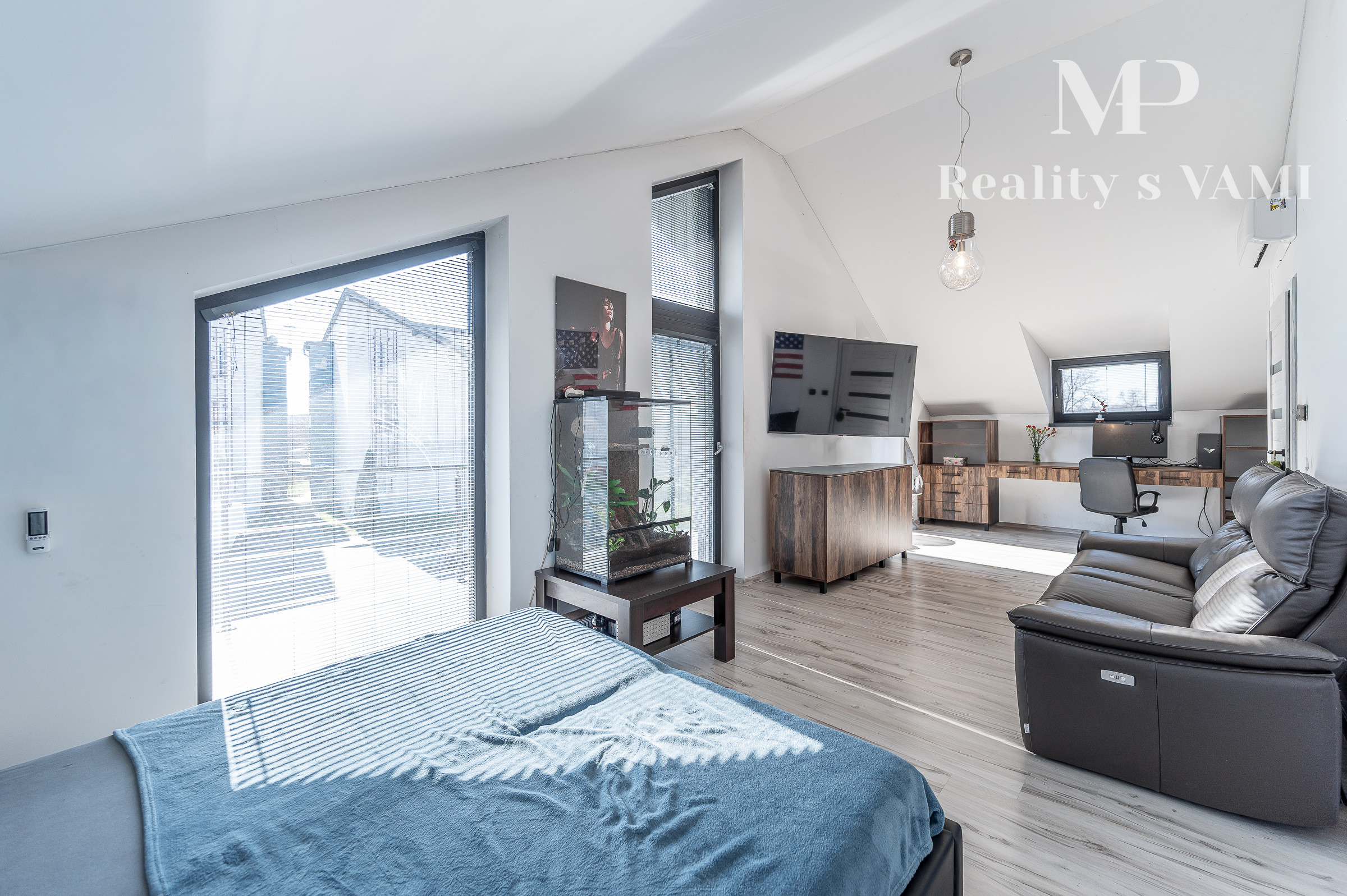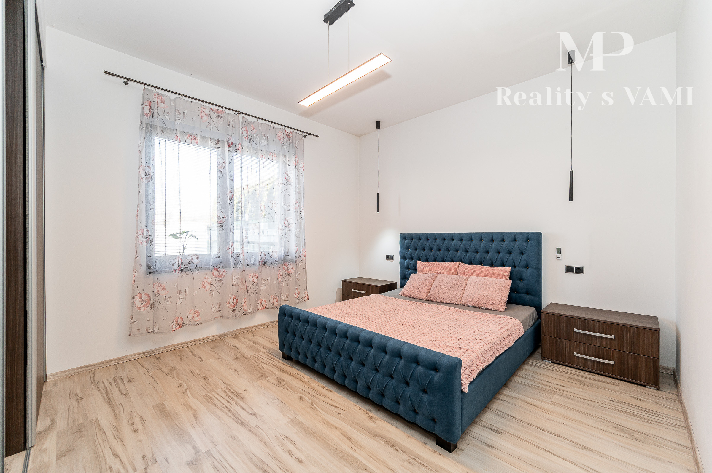 Prízemie domu ponúka praktické a zároveň veľmi komfortné rozdelenie priestoru. Nachádza sa tu vstupné zádverie, kúpeľňa s WC, samostatné WC, priestranná spálňa s vlastnou veľkou a luxusnou kúpeľňou, veľká obývacia izba prepojená s kuchyňou a špajza.Zo zádveria je priamy vstup do garáže, ktorá je krásne zariadená novým garážovým nábytkom a má kvalitnú dlažbu. Za garážou sa nachádza samostatná technická miestnosť.Na poschodie sa vystupuje schodiskom z obývacej časti. Podkrovie ponúka tri samostatné izby, šatník, kúpeľňu s WC a balkón. Súčasťou podlažia je aj priestranná terasa, ktorá vytvára ideálny priestor na oddych alebo rodinné posedenia.
